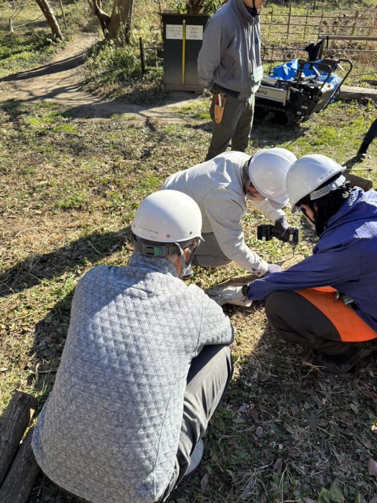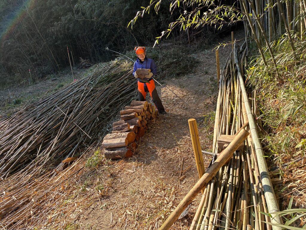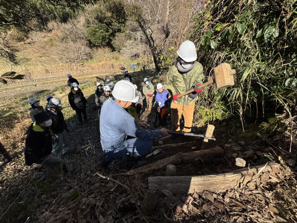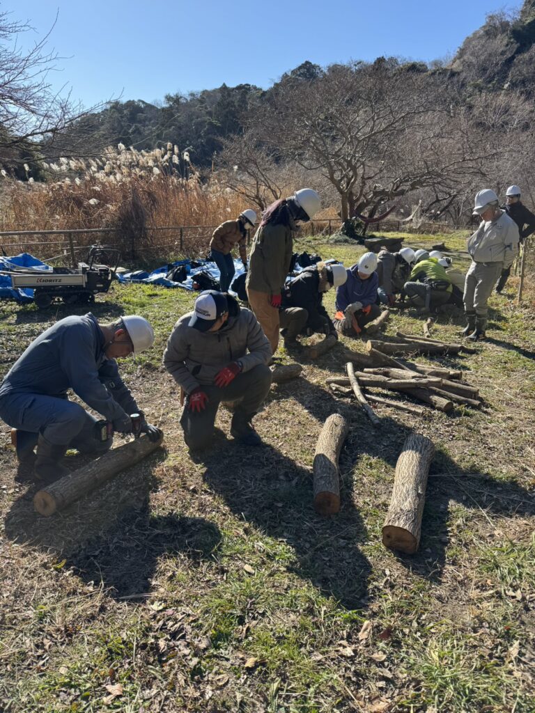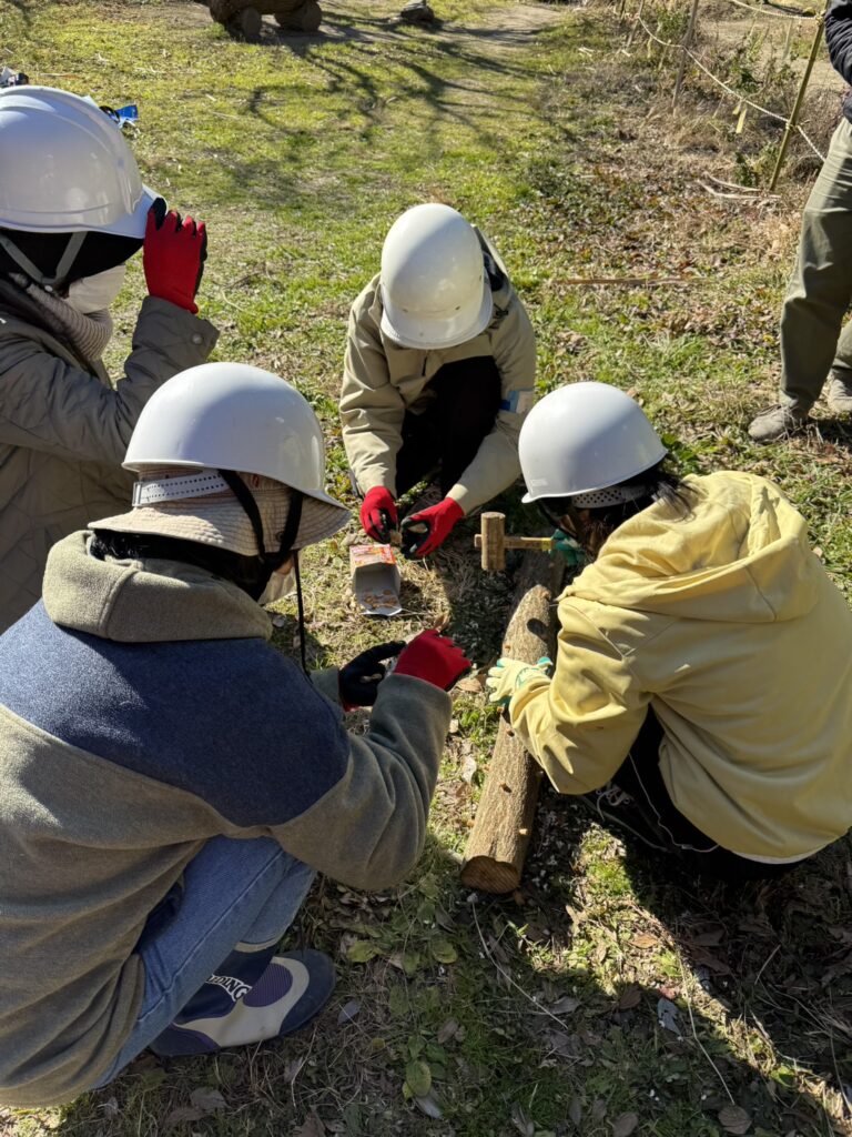 階段整備後は、数年前に植樹したコナラを伐採してシイタケ植菌をしました。伐採した切り株からは春、新しい芽(ひこばえ)が芽吹き、再び里山のサイクルが始まります。