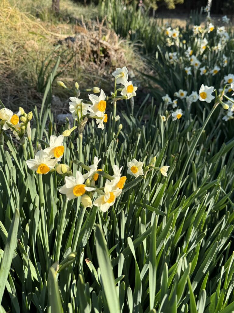 沢山池の駐車場側の土手にスイセンが咲いています。日本では、古くからその清楚な美しさと淡い芳香が好まれ、水仙が冬の季語として使われているように、冬を代表する花です。