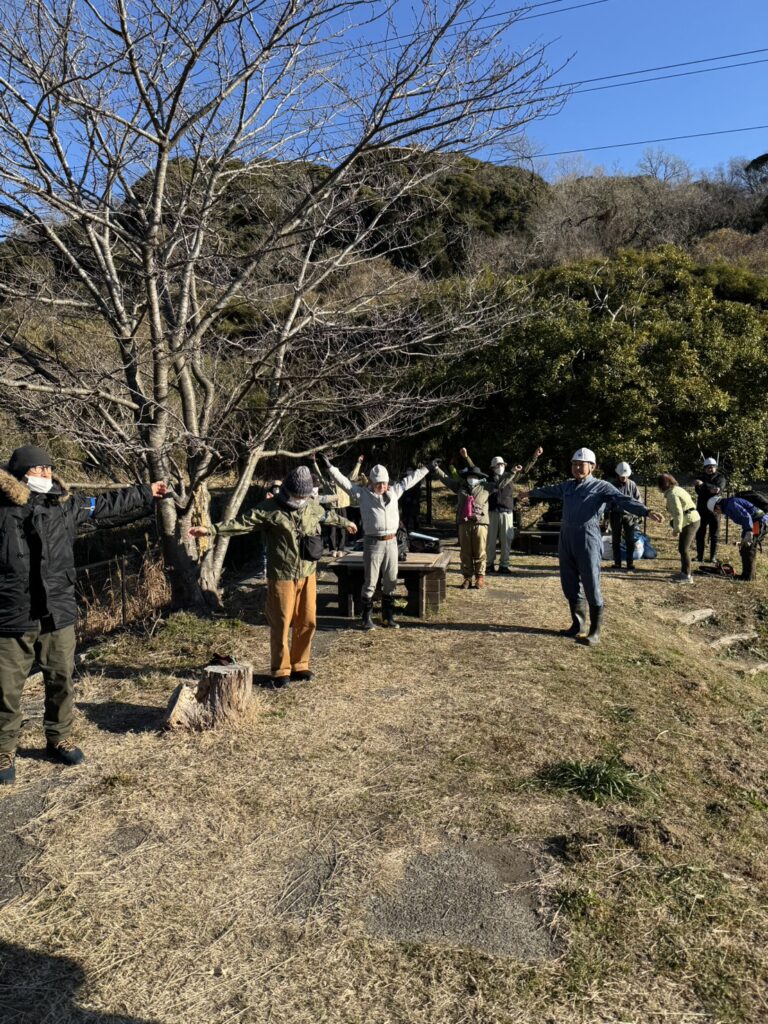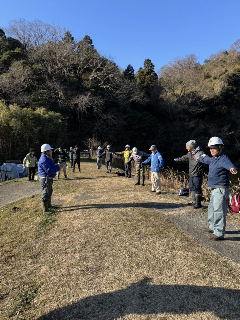 2026年最初のさとたん活動がスタートしました!まずは冬の澄み切った青空の下、さとたん会員とさと☆ぼら講習生合同のラジオ体操でしっかりと体をほぐします。