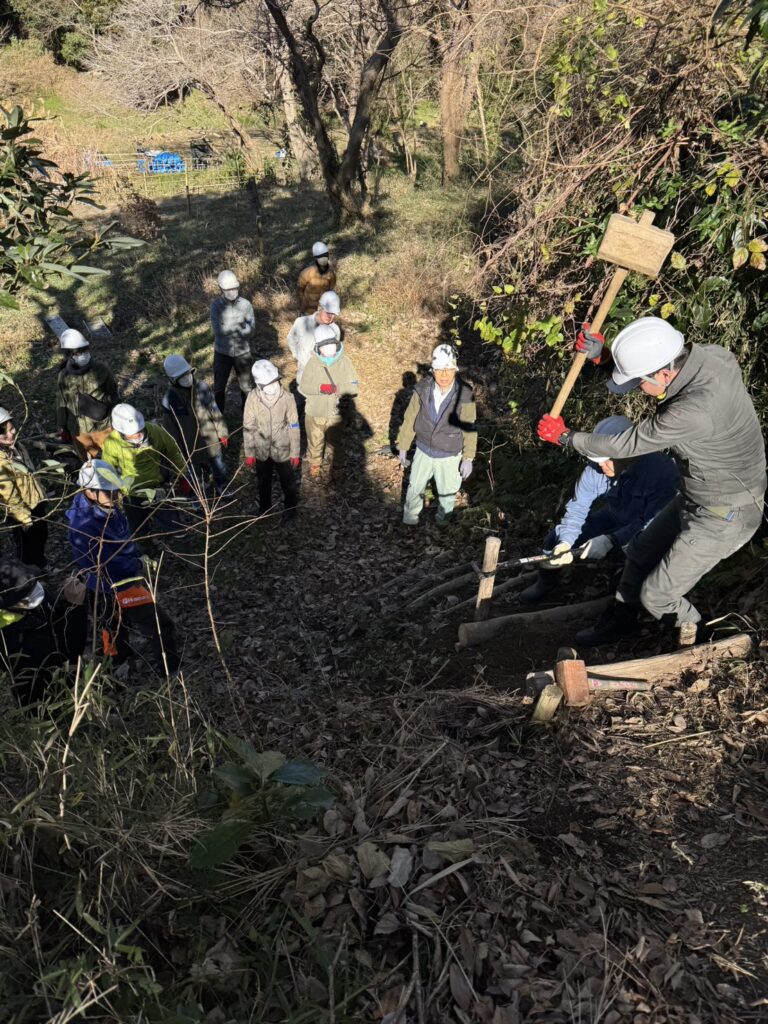 今回は、散策路をより歩きやすくするための階段整備です。材料には沢山池周辺の自然木を利用しています。