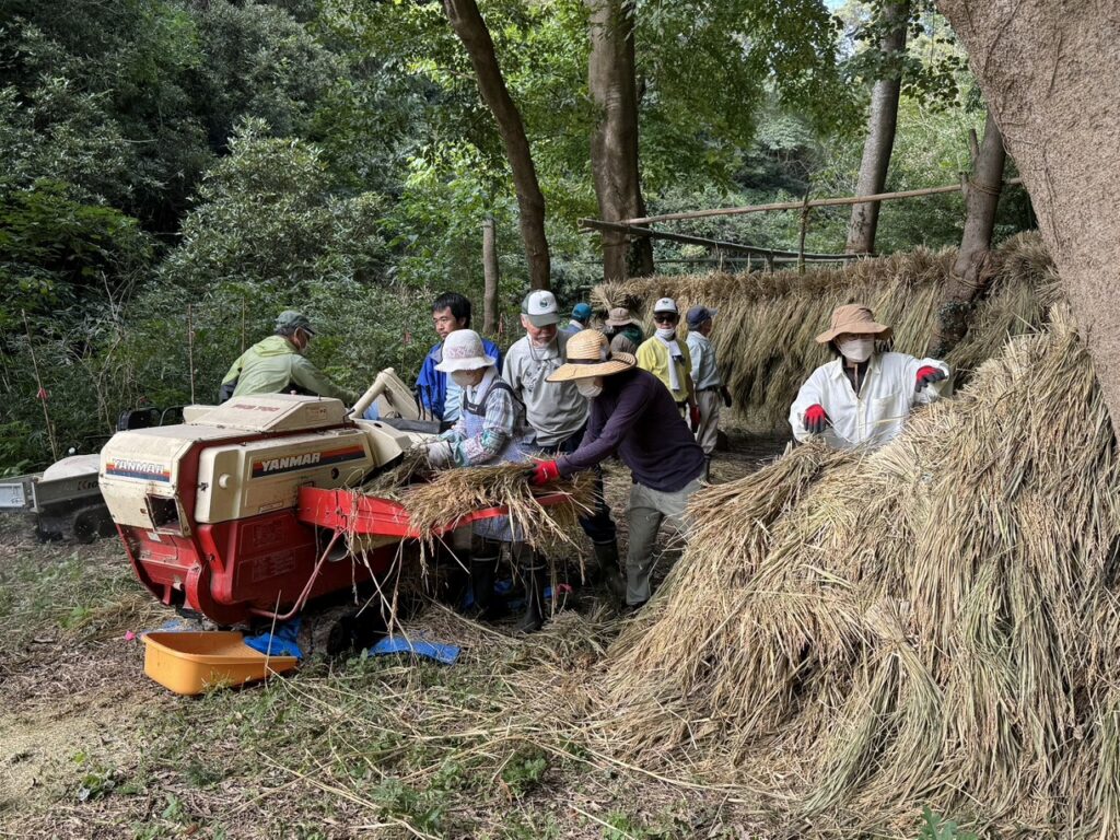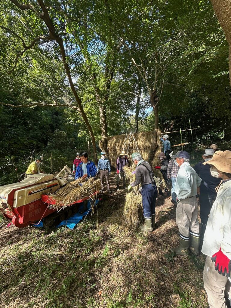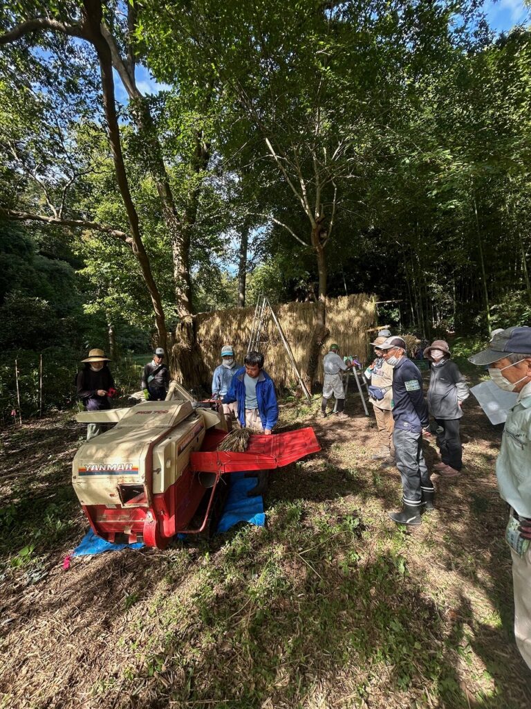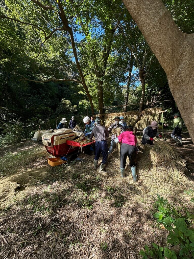 南田んぼと5段田んぼの脱穀が終了し、親子田んぼに移動して脱穀を再開しました。親子田んぼではもち米を栽培したので、11月の収穫祭では餅つきを行い、皆さんと収穫の喜びを分かち合いたいと思います。