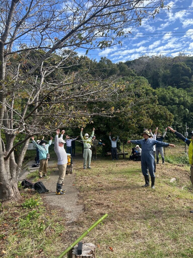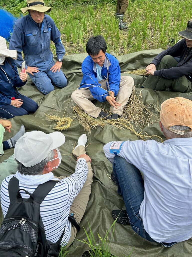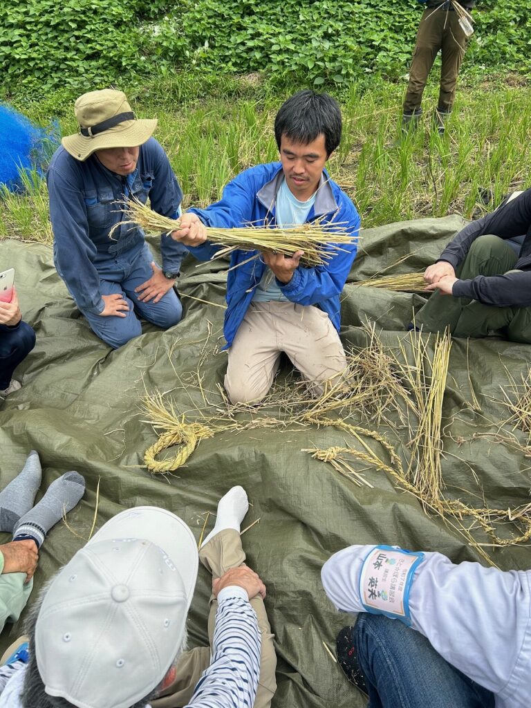 脱穀終了後、藁を使って稲縄やしめ縄の作り方を習いました。縄をなうのは初めてなので、コツをつかむのが難しいです。