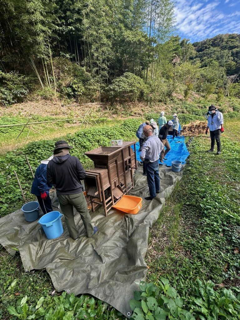 さとボラ講習では昔ながらの足踏み式脱穀機で脱穀を行い、唐箕で籾や藁くずなどを風の力を利用して選別を行います。