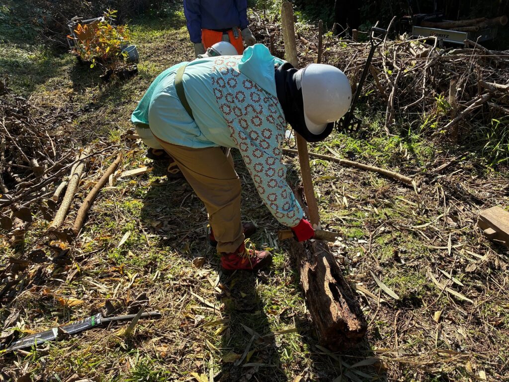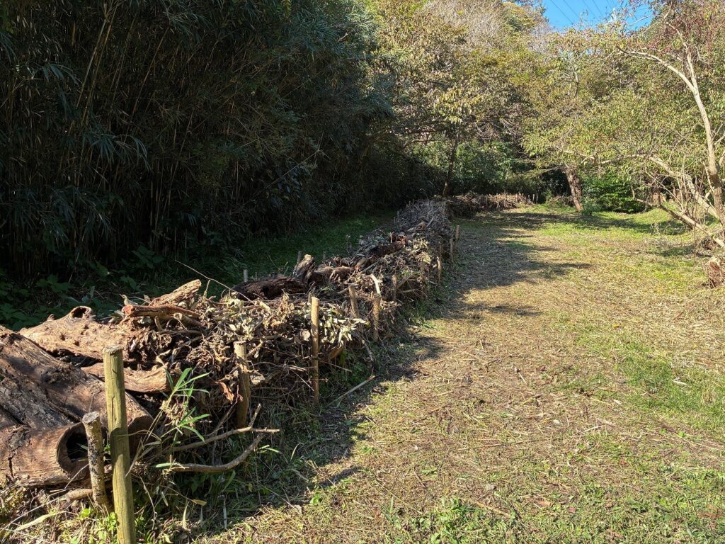 「カントリーヘッジ」とは、伐採した木の幹や枝でつくる低い柵のことで小動物の産卵場、かくれ場、エサ場や冬越しの場所として大切な役割があります。