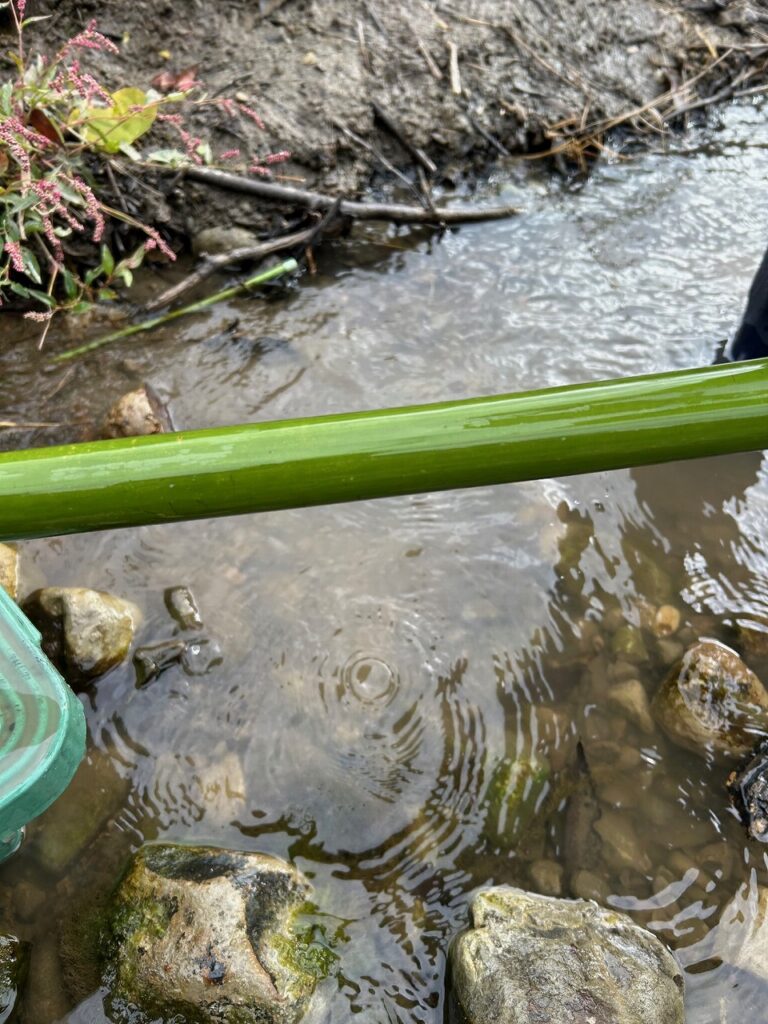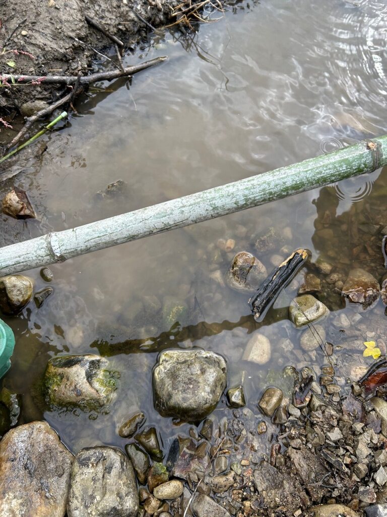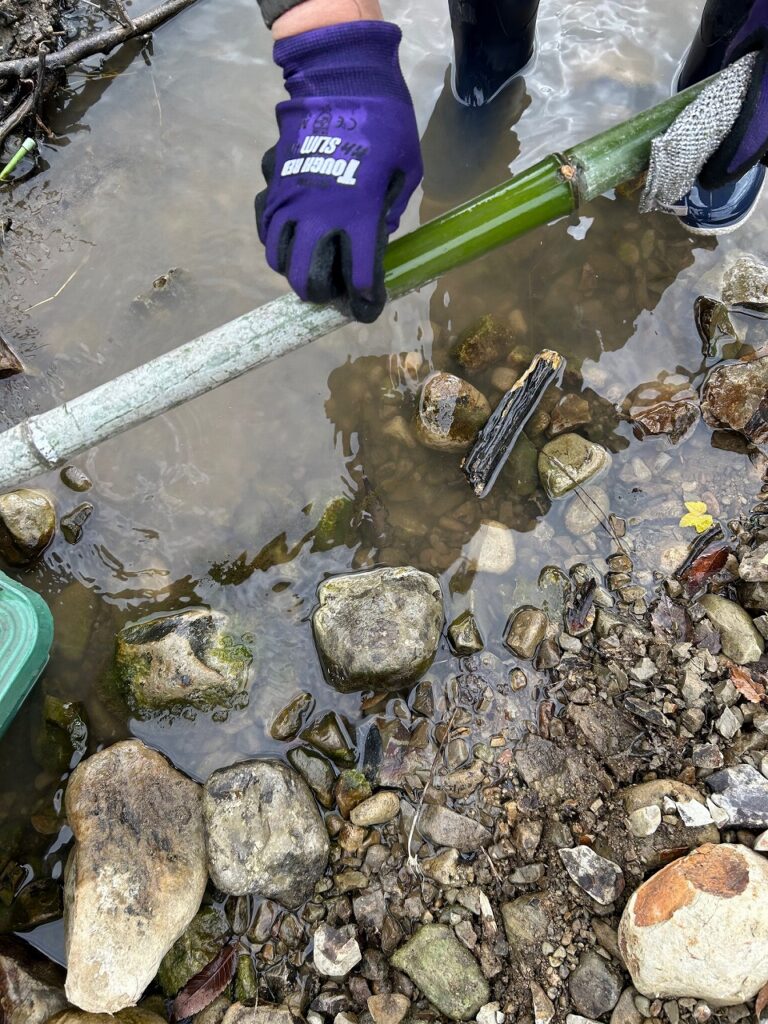 伐採した竹を河原に運び、水洗いを行います。竹の表面の汚れを冷たい川の水で洗い、きれいな青竹に仕上げます。