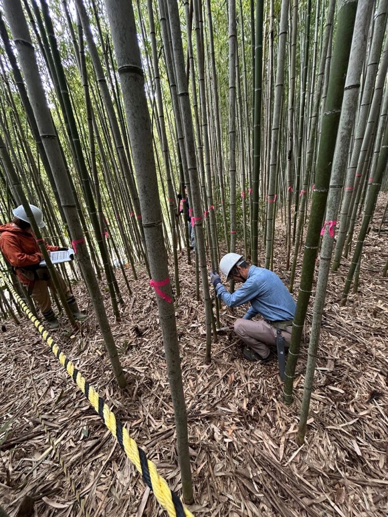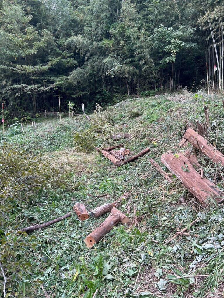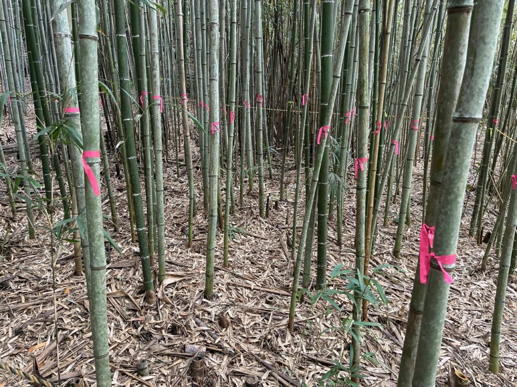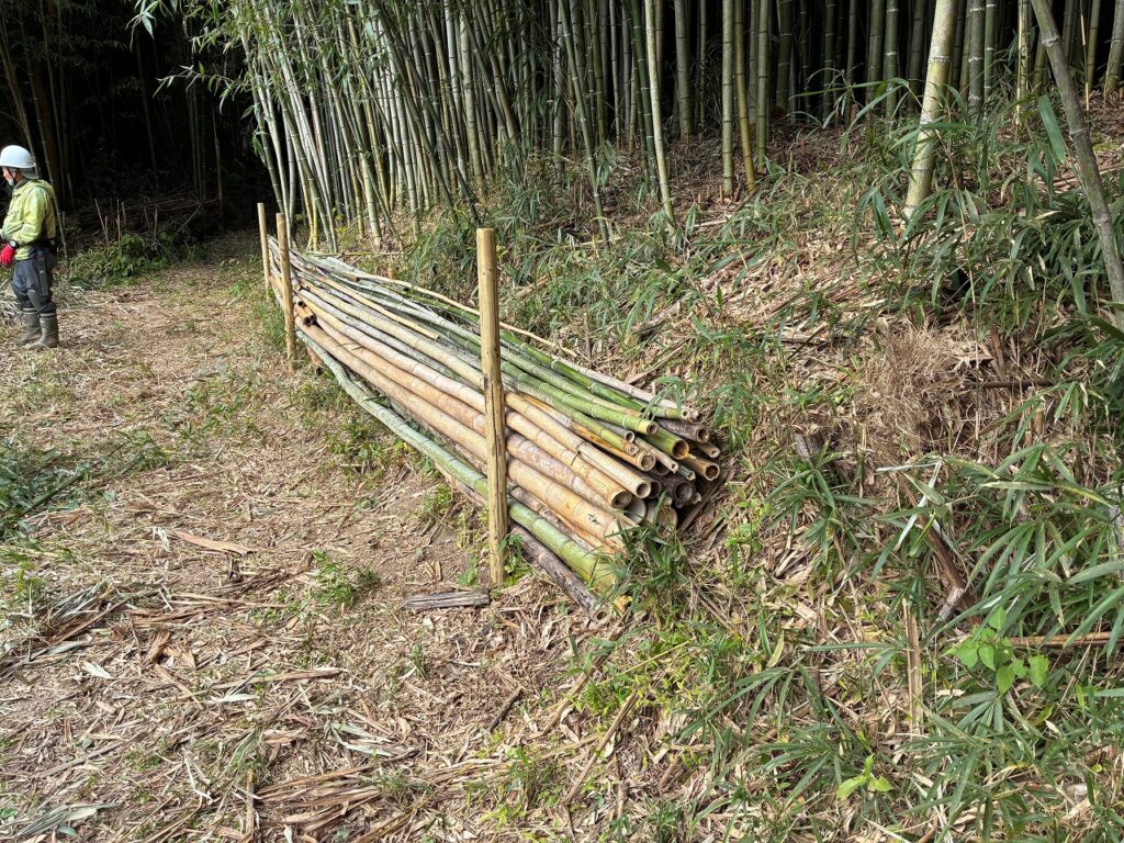 先週、竹林から搬出した土留め用の太いタケを土留めにしました。モニタリング場所のタケの本数を確認、35本程度までに刈り取りました。