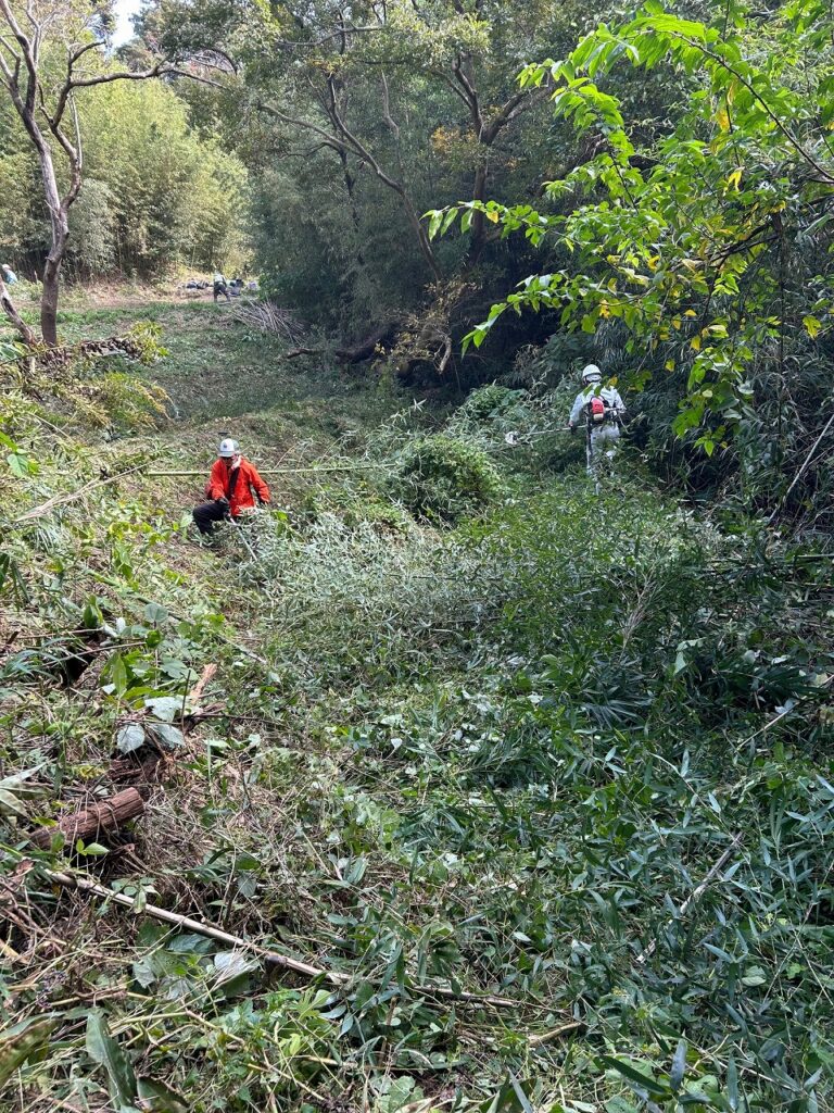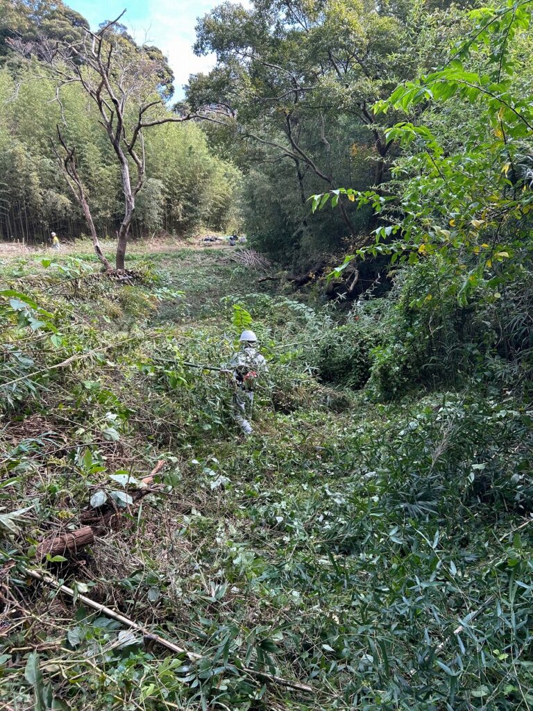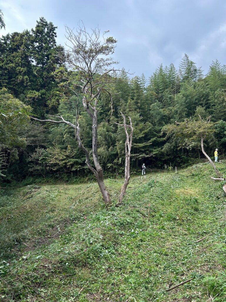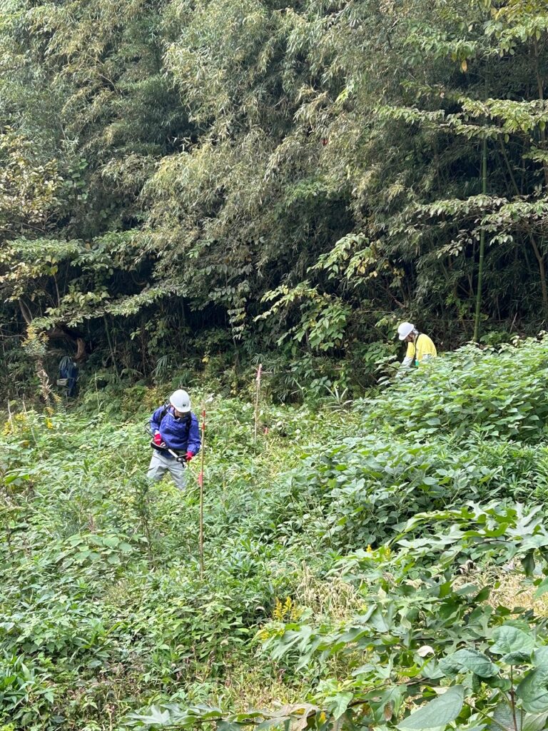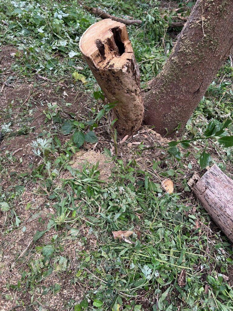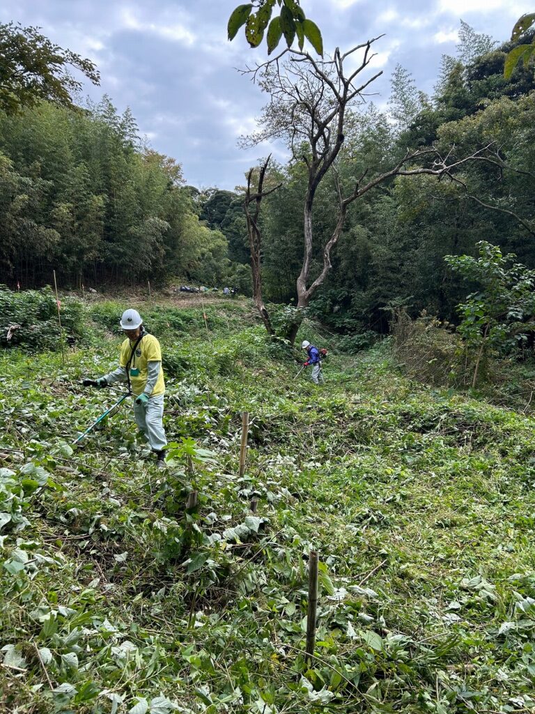 草、ツルが伸び果樹の苗が隠れるほど伸びたので草刈りを行いました。
