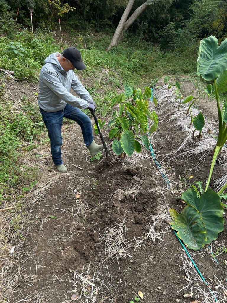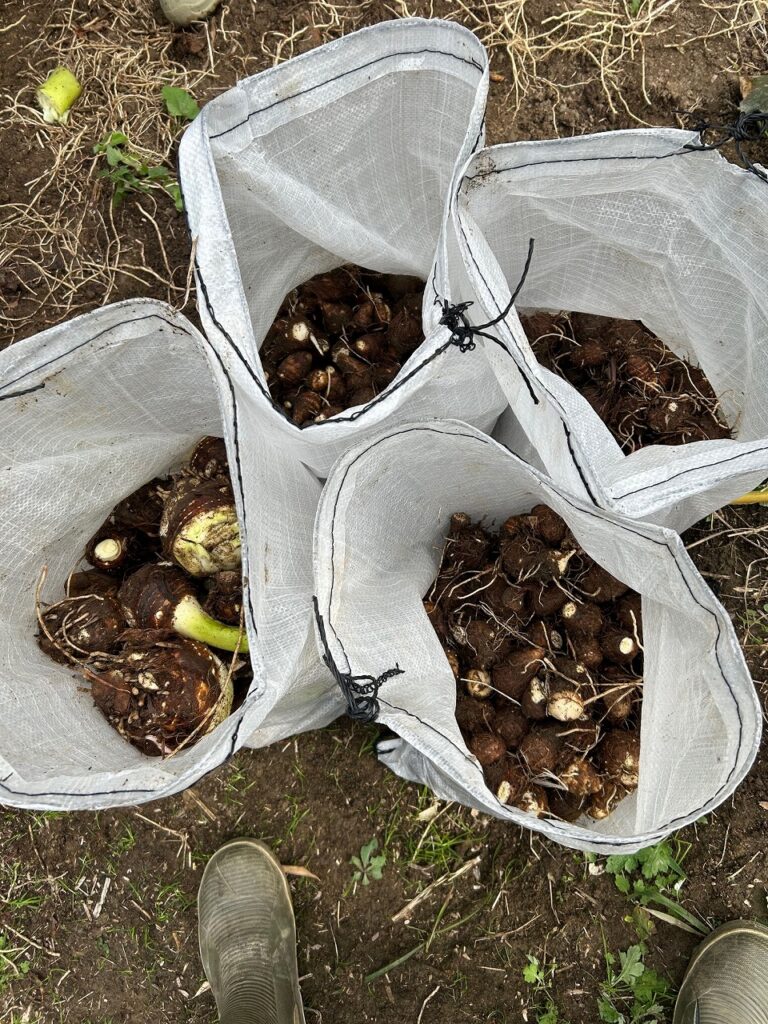 サトイモ(土垂どだれとセレベスの2品種)を収穫しました。今年は豊作で来週の収穫祭に提供する汁物にサトイモが沢山入っていると思います。