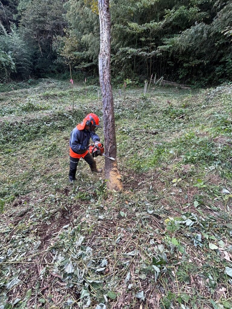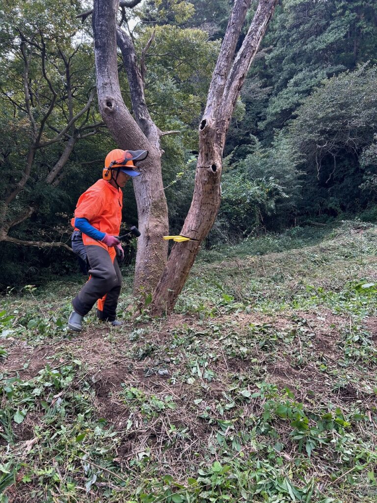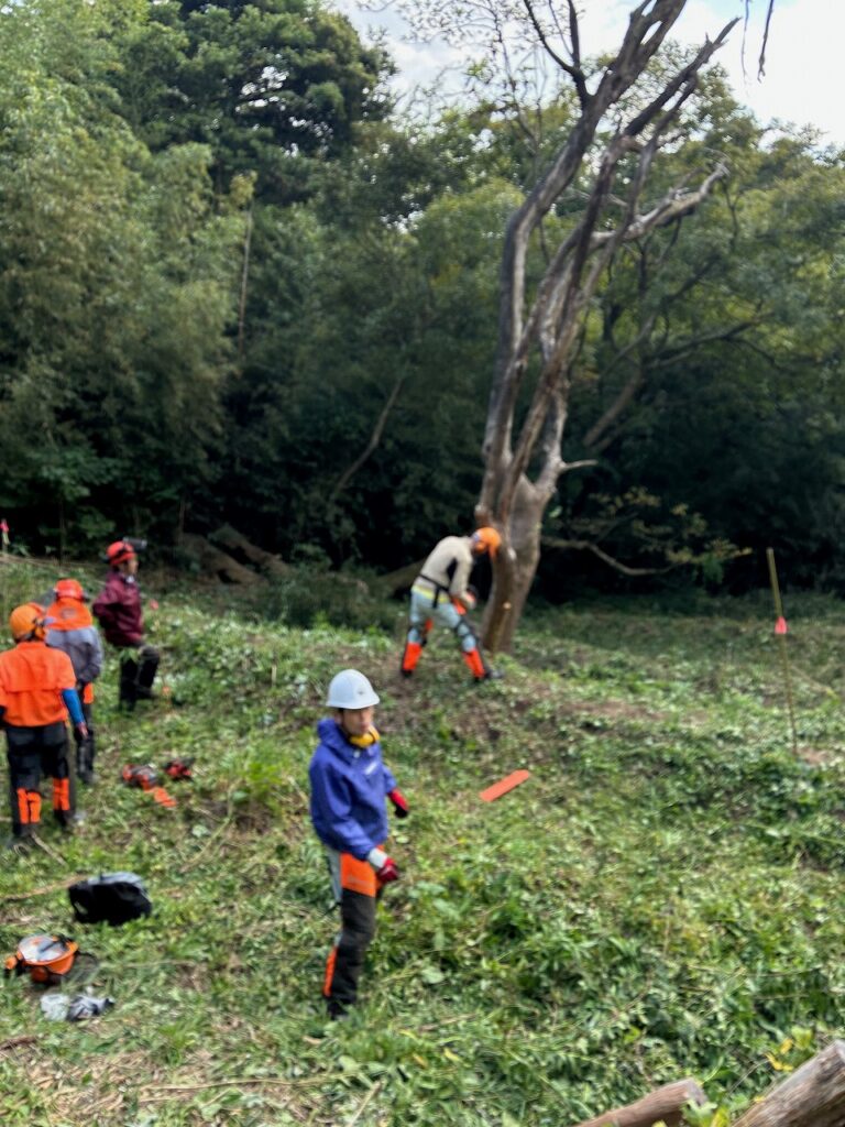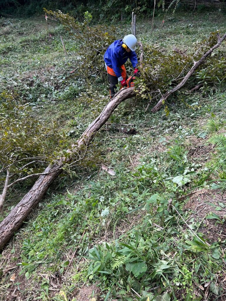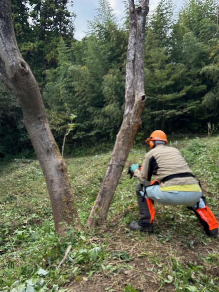 作業前に保護具の点検とチェーンソーの点検・整備を行った後、伐倒作業を行う果樹地に向かいました。そこで、2本の立ち枯れた木に対して受け口と追い口を切り、クサビを打ち込むことで安全に伐倒する方法を学びました。伐倒した木は有効活用出来る長さに玉切りしました。