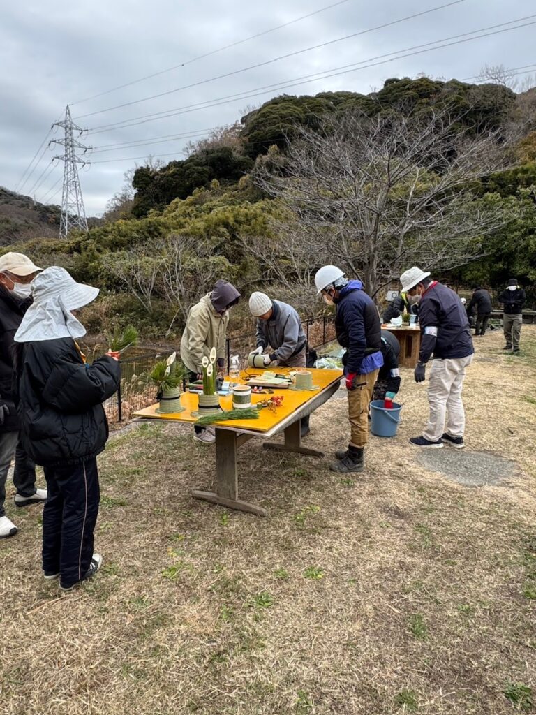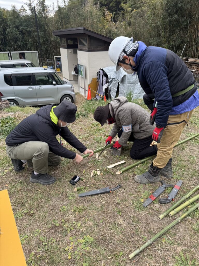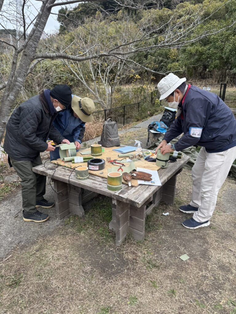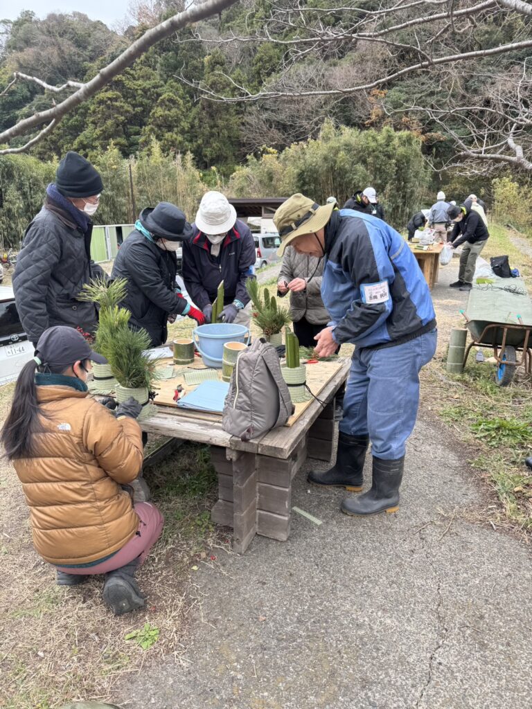 この冬一番の寒さの中、さとたん会員と里山ボランティア育成講習会の講習生が合同でラジオ体操を行い、体をほぐします。その後、林野庁交付金活動と里山ボランティア育成講習会の「門松づくり」講師の2班に分かれて活動を開始します。
