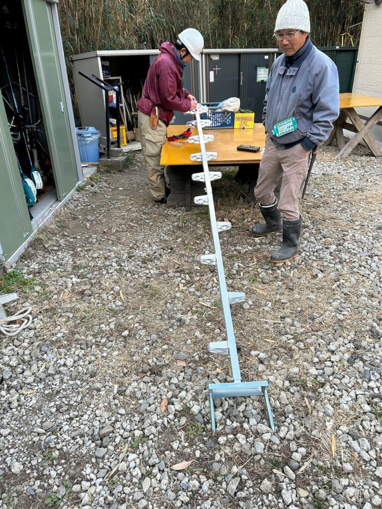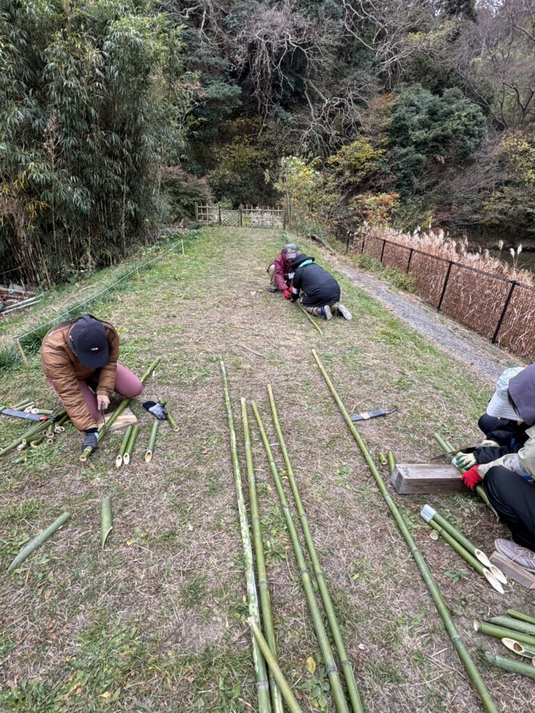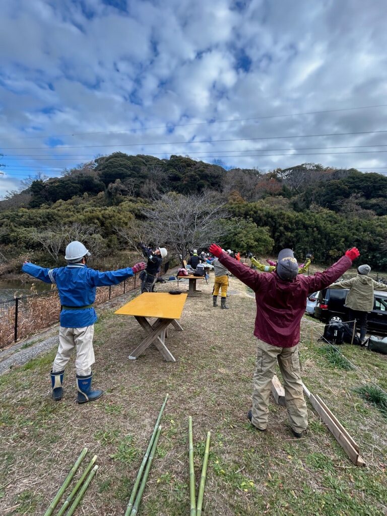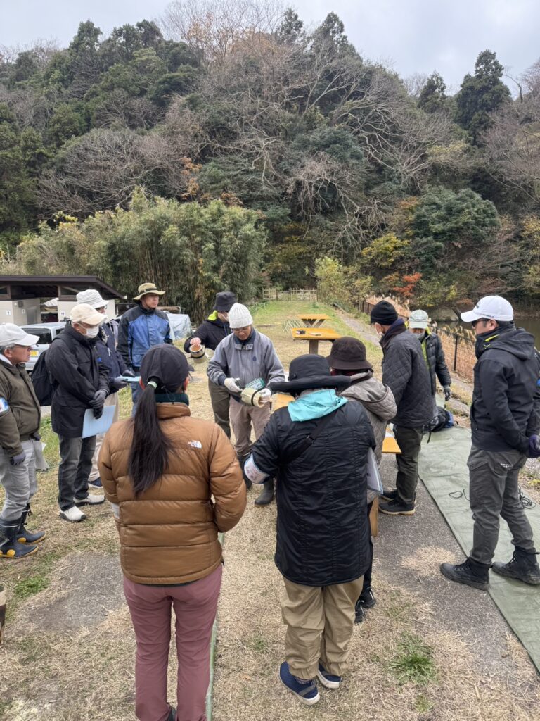 この冬一番の寒さの中、さとたん会員と里山ボランティア育成講習会の講習生が合同でラジオ体操を行い、体をほぐします。その後、林野庁交付金活動と里山ボランティア育成講習会の「門松づくり」講師の2班に分かれて活動を開始します。