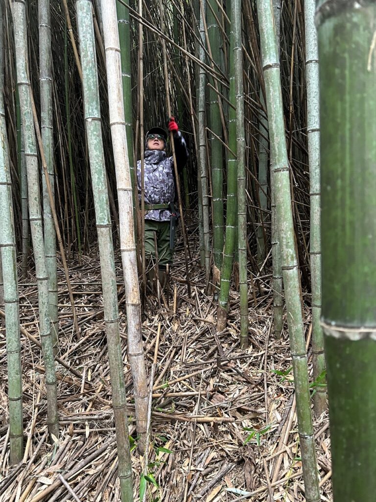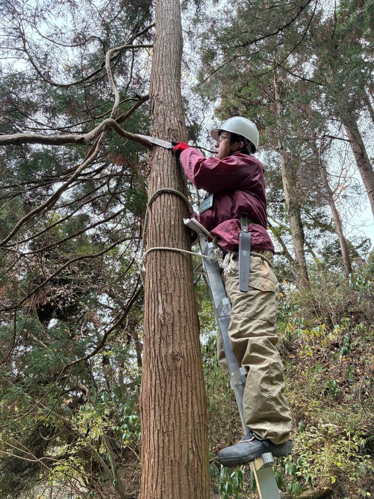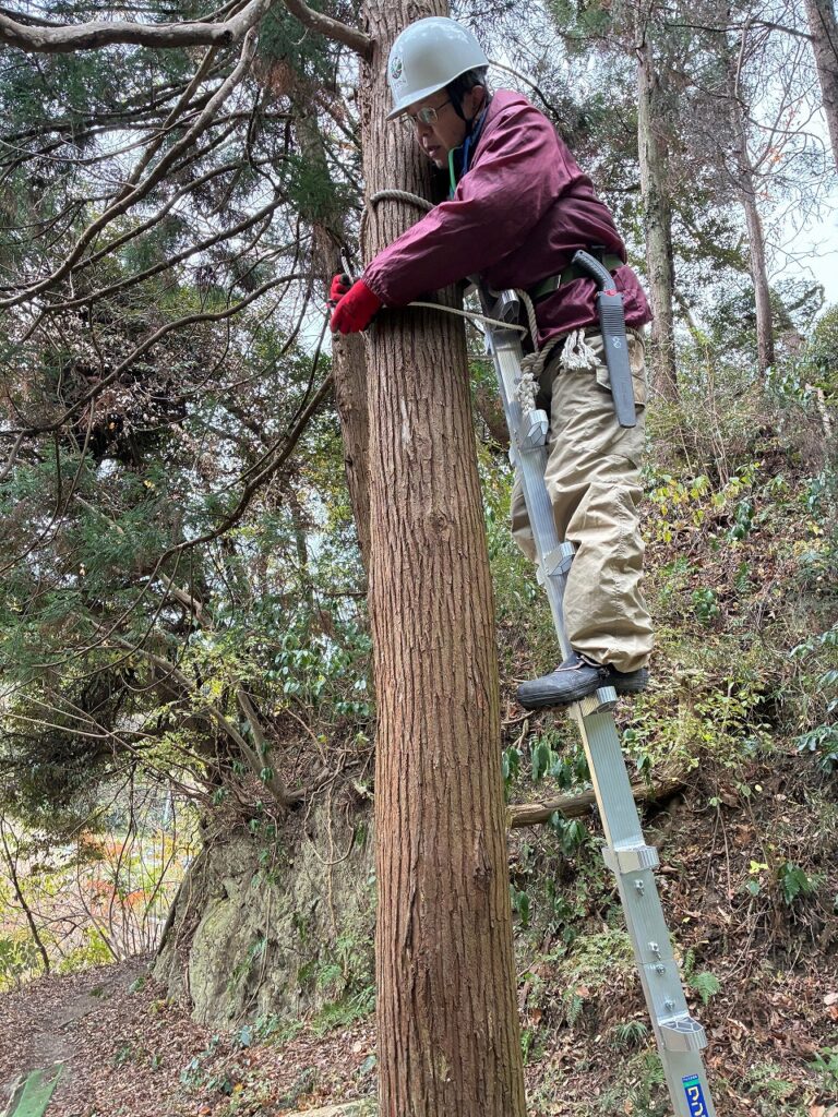 セブンイレブン記念財団の助成金で購入した高枝切り梯子で、スギの木の枝落としをしました。