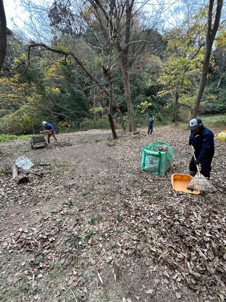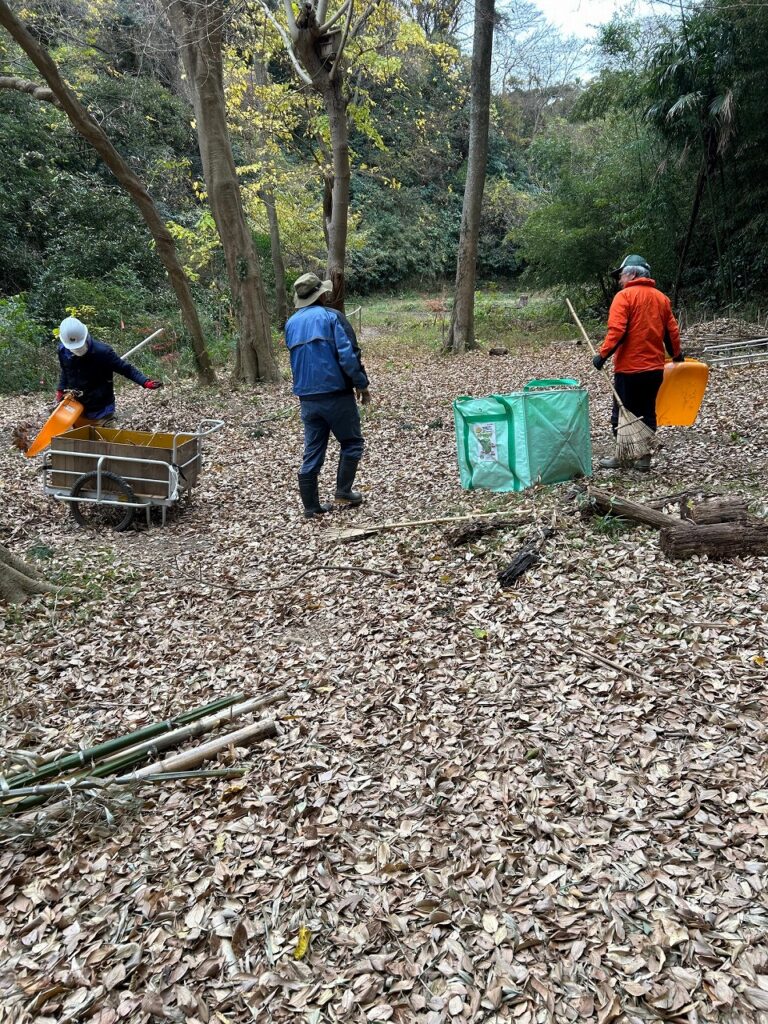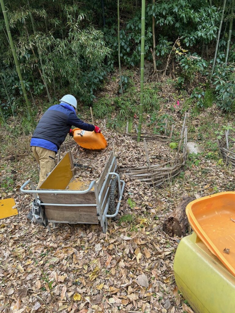 南田んぼ下の竹林広場に堆積した落ち葉を集めて、堆肥を作りをします。自然界では土壌生物や微生物に分解されて栄養豊富な「腐葉土」となります。