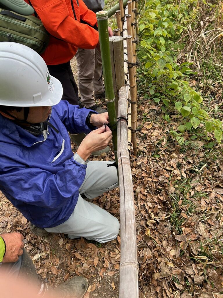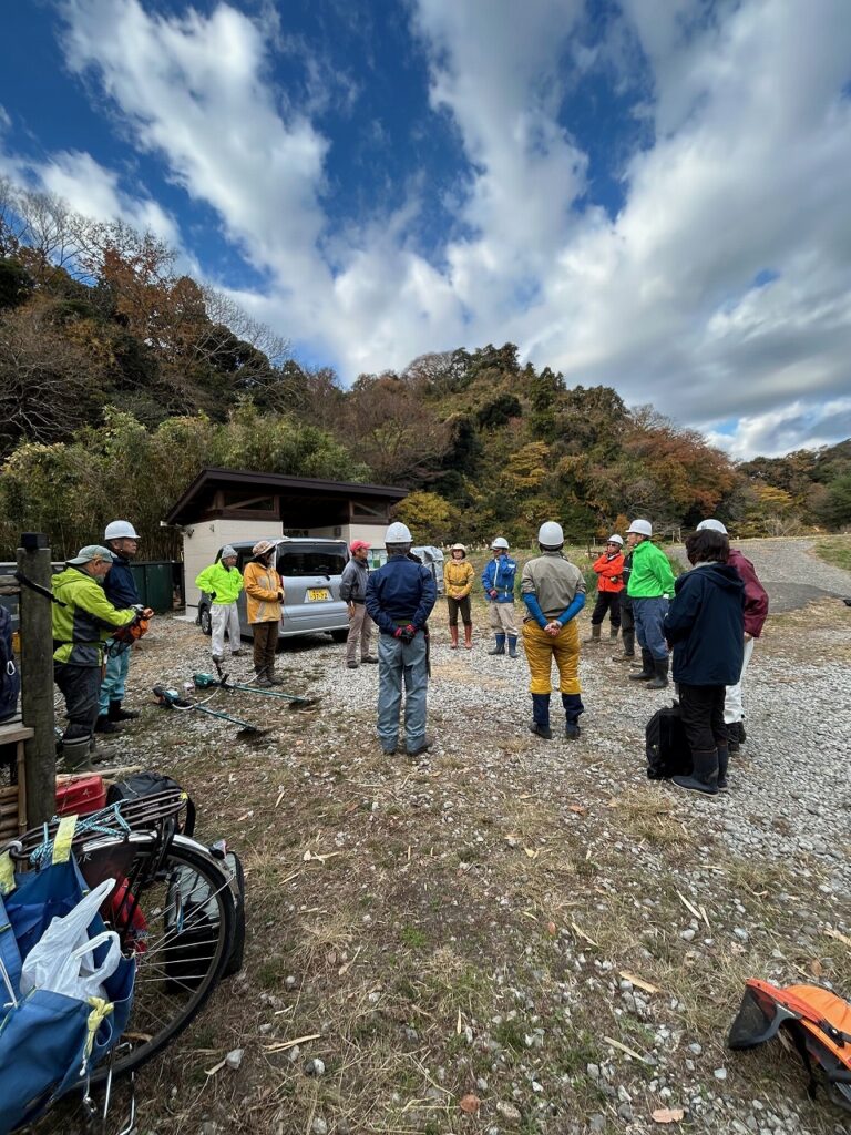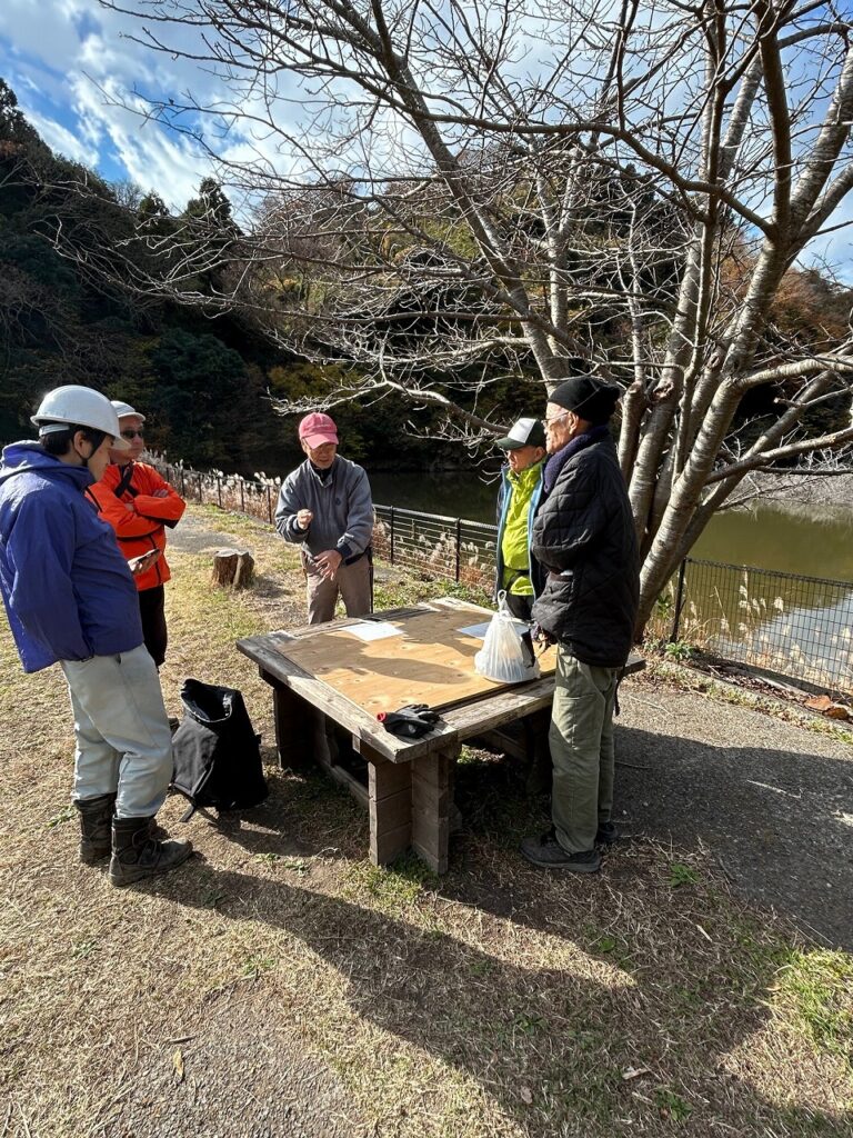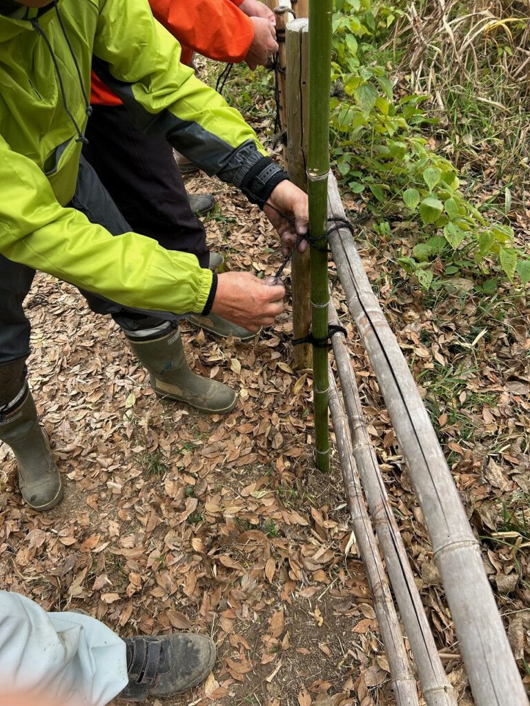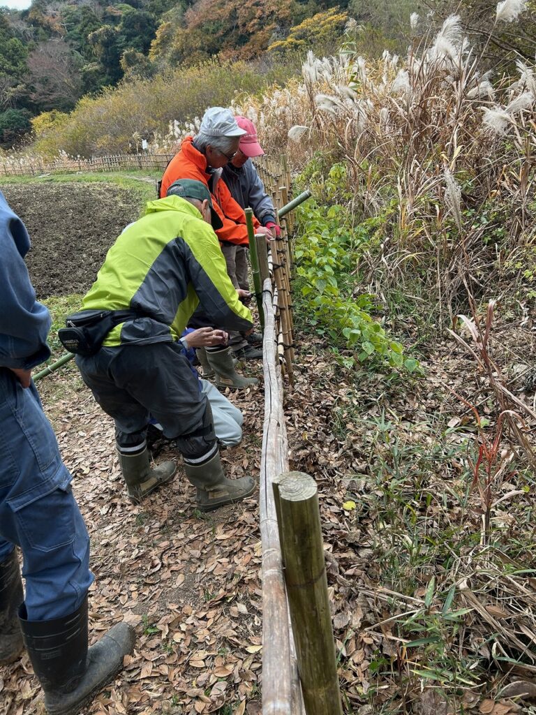 13日(土)には、さと☆ぼら講習での門松作りが行われます。また、14日(日)には長坂緑地里山活動連絡会主催の自然体験会「里山の素材で門松づくり」が開催されるため、作り方の打合せと飾りつけの男結びの練習を行いました。