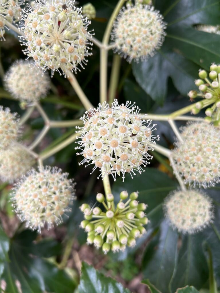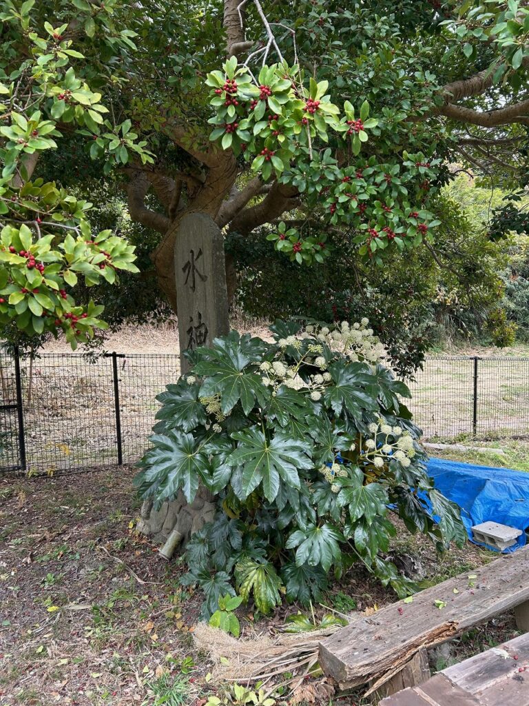 沢山池の水神碑の側に、ヤツデの丸く白い花が咲いています。