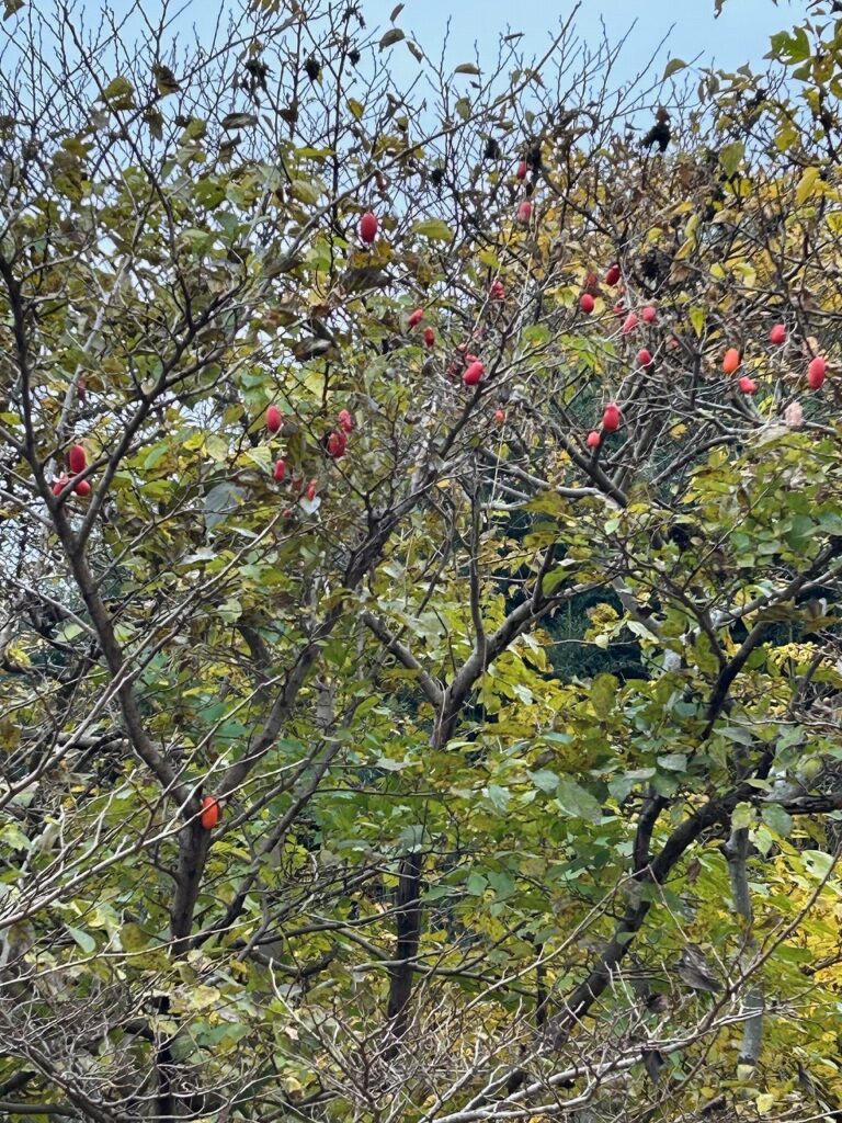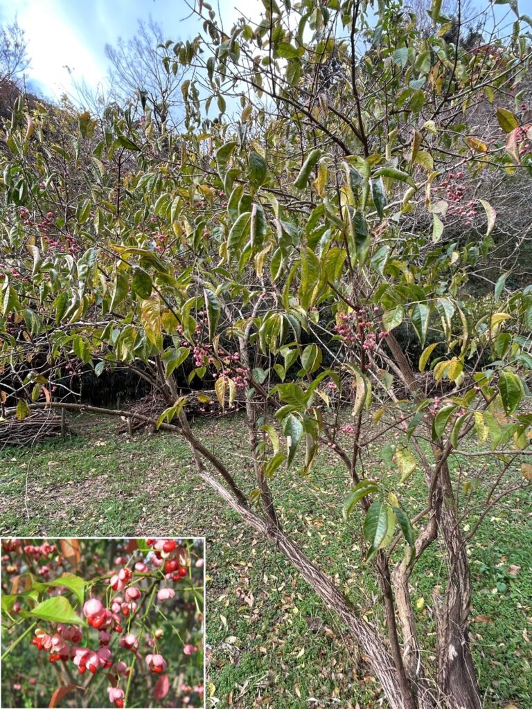カントリーヘッジの側に、マユミの赤い実が実っています。