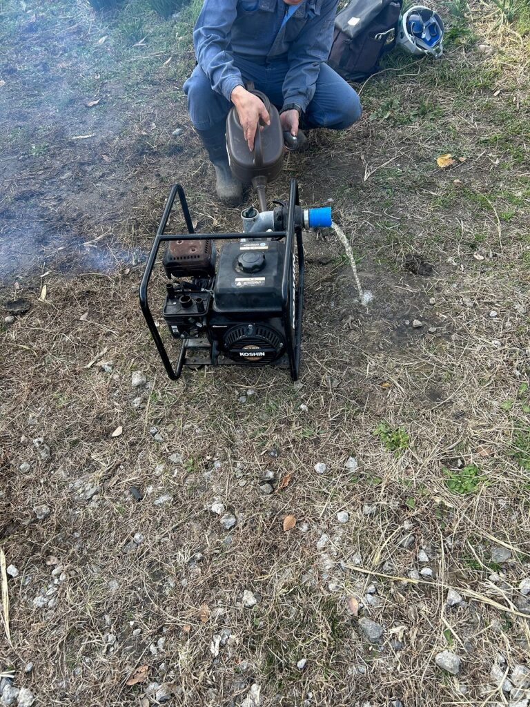 9月5日の台風15号によって水没し、動かなくなった揚水ポンプの修理が完了しました。試運転を行ったところ、最初は白煙が出ましたが、しばらくアイドリングを続けると白煙も出なくなり、揚水ポンプは完全に復活しました。