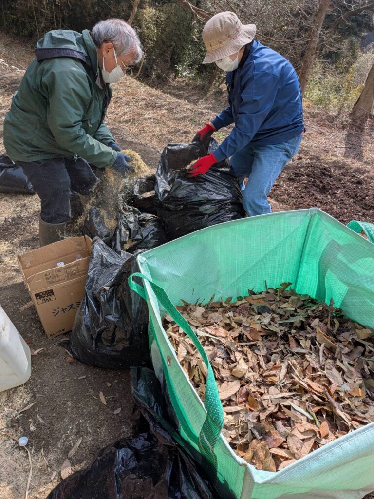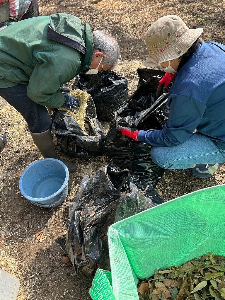 先日チッパーで細かく砕いた稲わらに、集めた落葉と土を混ぜ合わせ、黒いビニール袋へ。そこに米のとぎ汁を加えて、約8週間じっくりと発酵させて堆肥を作ります。収穫祭で美味しいサトイモを育てるための、大切な土壌改良の準備です。