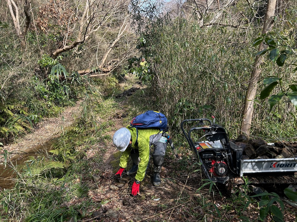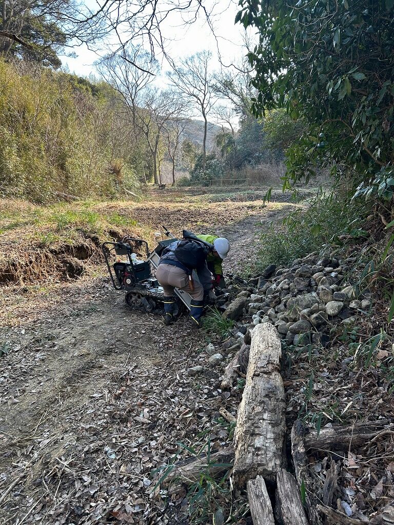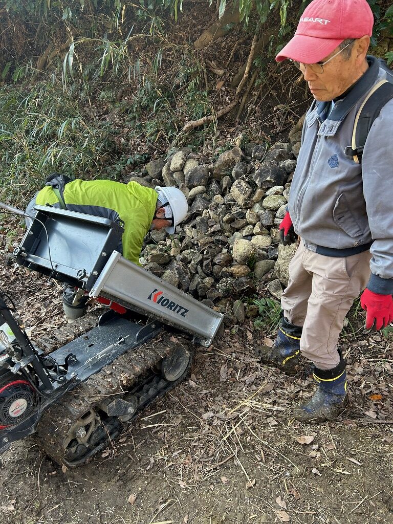 先週に引き続き、サワガニ河原から石垣用の石をクローラーに積み込み、南田んぼ横の堆積場へ運びます。立派な石垣を作るには、まだまだ膨大な量の石が必要なので、根気強く運搬作業を続けていきます!