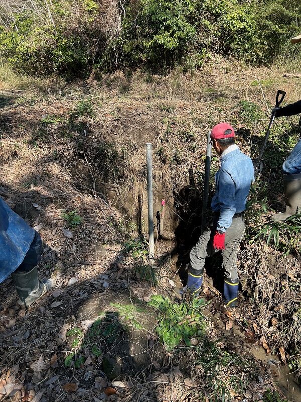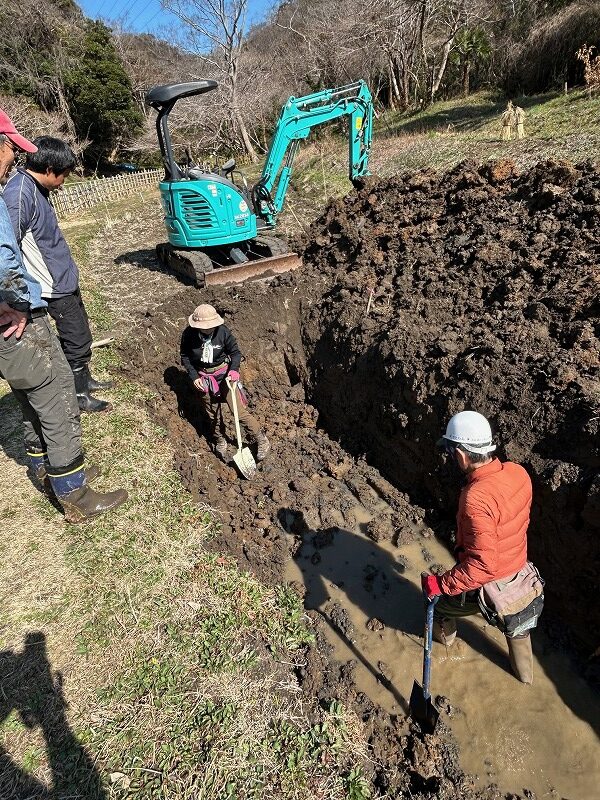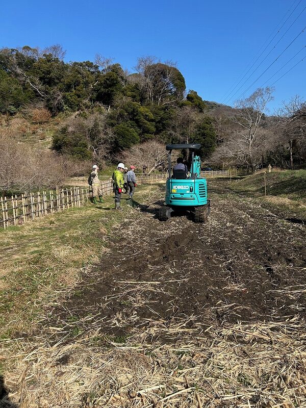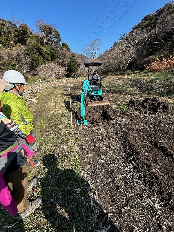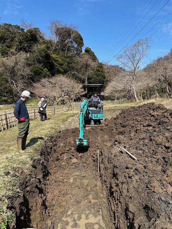 毎年、親子田んぼは穴が開き漏水対策に追われてきました。アメリカザリガニが穴を開けていると思われます。今年は根本的な解決を図るため、ユンボで田んぼを深く掘り下げ、底にブルーシートを敷いて水の抜け道を塞ぐ対策を講じることといたしました。NPO法人三浦生物多様性保全と共同作業です。