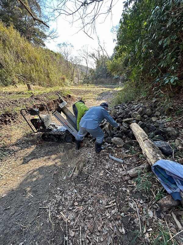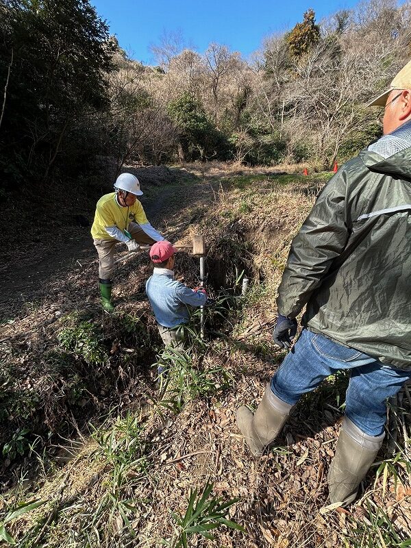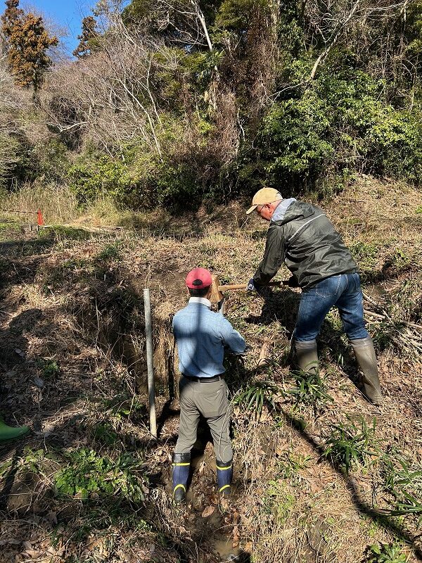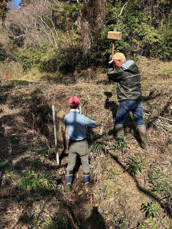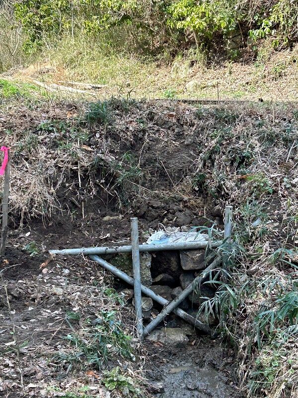 南田んぼの用水路崩落防止に鉄菅を杭にして石垣を作りました。