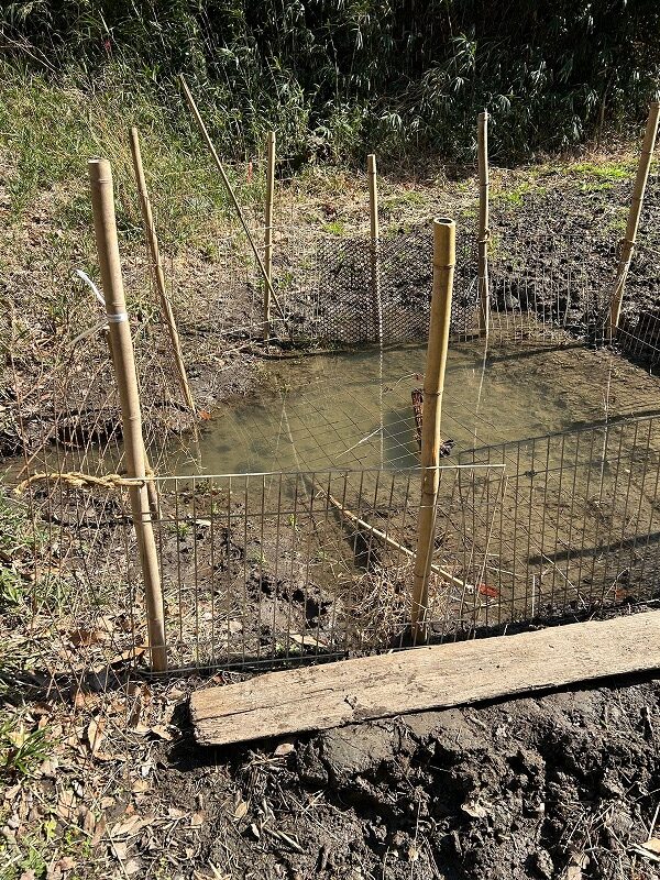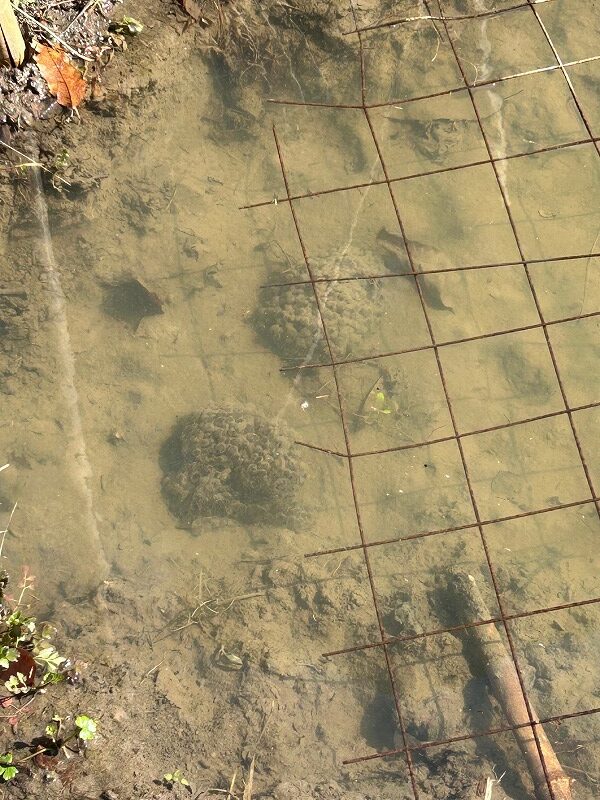 南田んぼでヤマアカガエルの卵を確認しました。春の訪れを感じます。アライグマやカルガモなどの捕食者から守るため、周囲を金網フェンスで囲いました。ヤマアカガエルの卵は約2週間で孵化します。
