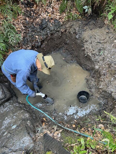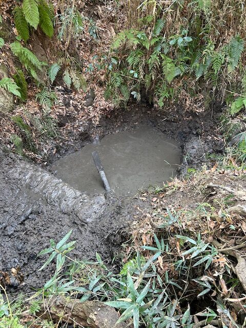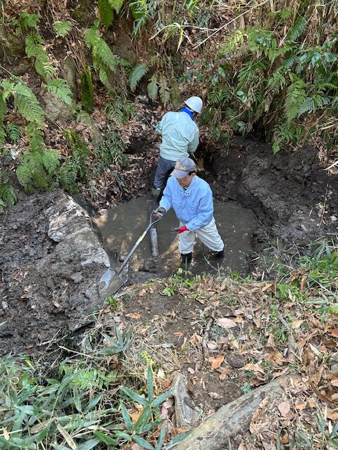 五段田んぼへ給水する堰の嵩上げと堆積した土砂を取り除き、土砂に埋まっていた取水口を掘り起こして通水の確認をしました。