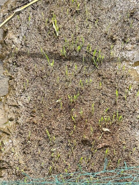 4月5日に種もみを直播した苗床から2㎝程の芽が出ていました。