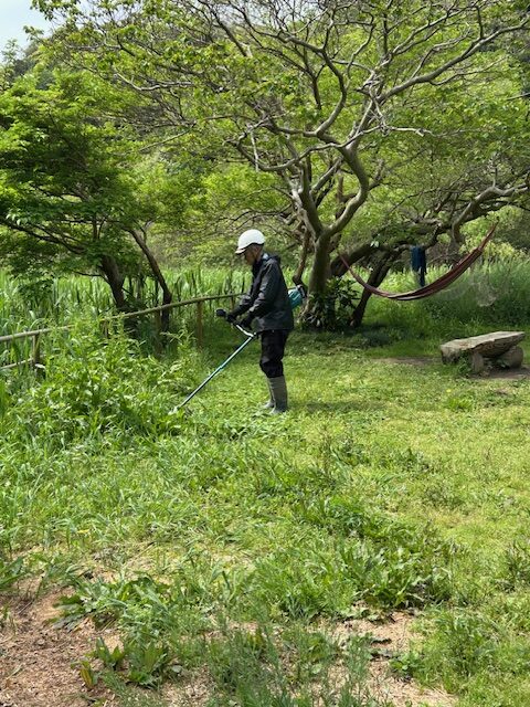 来園者が憩うサワガニ河原広場は、特に念入りに草刈りを進めます。