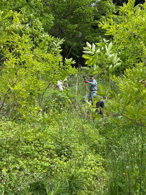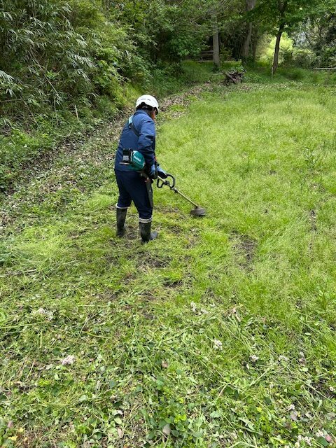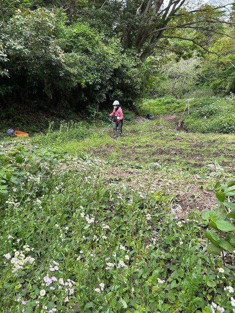 植樹した苗木の周辺を草刈りします。枯草一色だった樹林地も、春になり若草に覆われるようになりました。