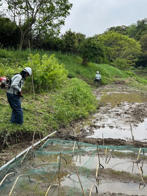親子田んぼでの草刈は田んぼに水が入り、足元に注意が必要です。