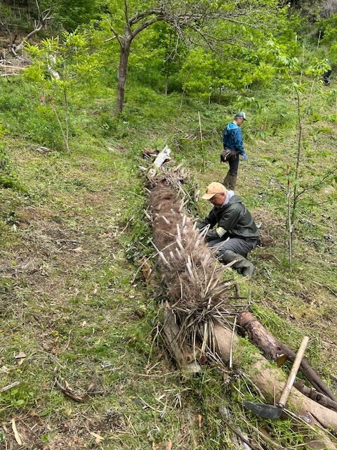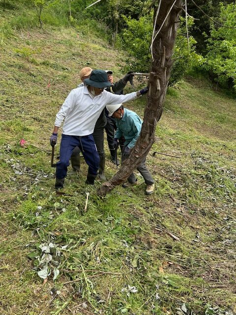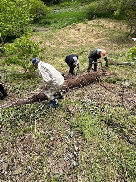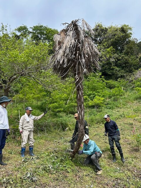 樹林地の草刈りが早く終了したので枯れたシュロの木を伐倒し、これにより散策路の安全を確保し、通りやすく整備しました。